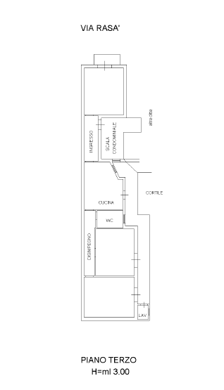 L’immobile si trova in Via Rasà n. 43, al terzo piano di un edificio anni 60, composto da complessivi sei piani e servito da ascensore.